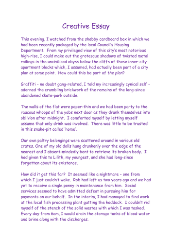 Glossy, lifeless flakes drifted down, glistening in the bright light of the harvest moon. The sheer darkness overpowered by the scented white imaginative writing essay of the winter snow. I emerged, dreary from the recent routine sleepless night. My displacement only heightened by rejection and segregation affiliated by my isolation. My only loyalty was attached to the abandoned, out-casted convenience store, disconnected from the community, the place I called home for the past 6 months. I cherished the indifference and solidarity we shared, and I would defend it with my life.