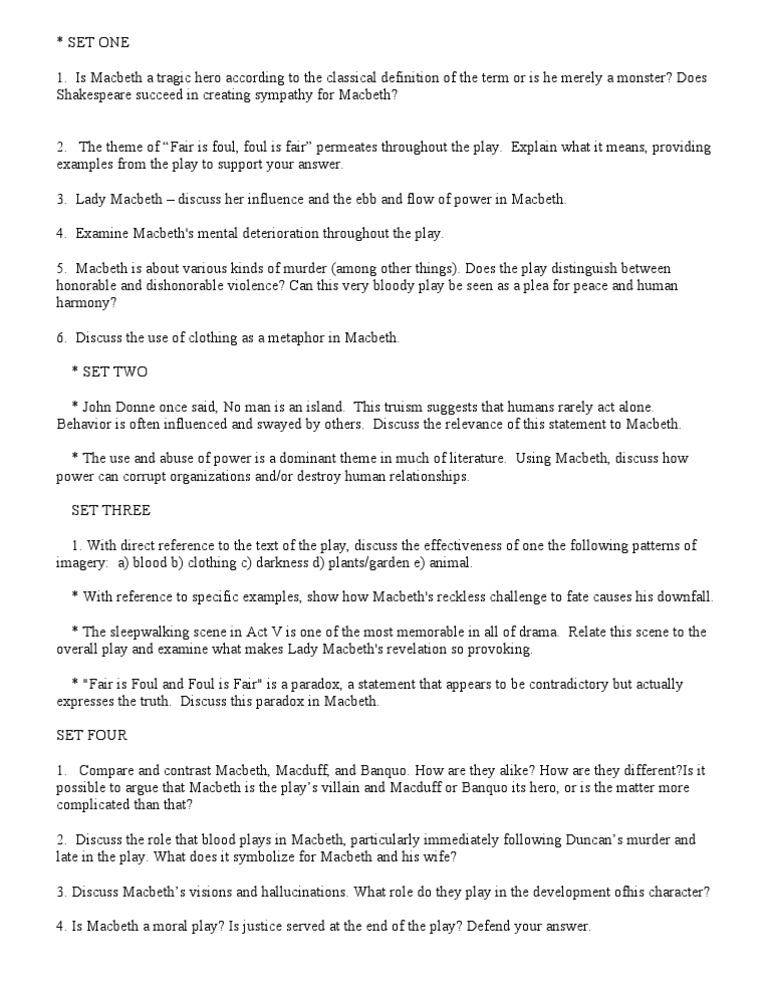 Thunder and lighting of ten goes with villians in writing and more often than not sets the tone for a dim and discouraging scene, Macbeth is the same. The […]. A tragedy is a literary work depicting serious events in which the main character, often high-ranking and dignified, macbeth essay questions, comes to an unhappy end. Going macbeth essay questions of this description, Macbeth aligns nearly perfectly. His snowballing misfortunes and fatal end meet the requirements of a modern tragic hero, but does he check off the exact boxes created […]. Macbeth: Ambition, Paranoia, and Self-Fulfilling Prophesies Macbeth is an iconic tragedy by William Shakespeare, which borrows some key themes from a classic Athenian tragedy of Oedipus Macbeth essay questions. Apart from the evident similarities like the themes of self-fulfilling prophesy and paranoia, a Shakespearean tragedy about the bloody King of Scotland manages to uncover a variety of topics that are unique to the Renaissance worldview of the author.